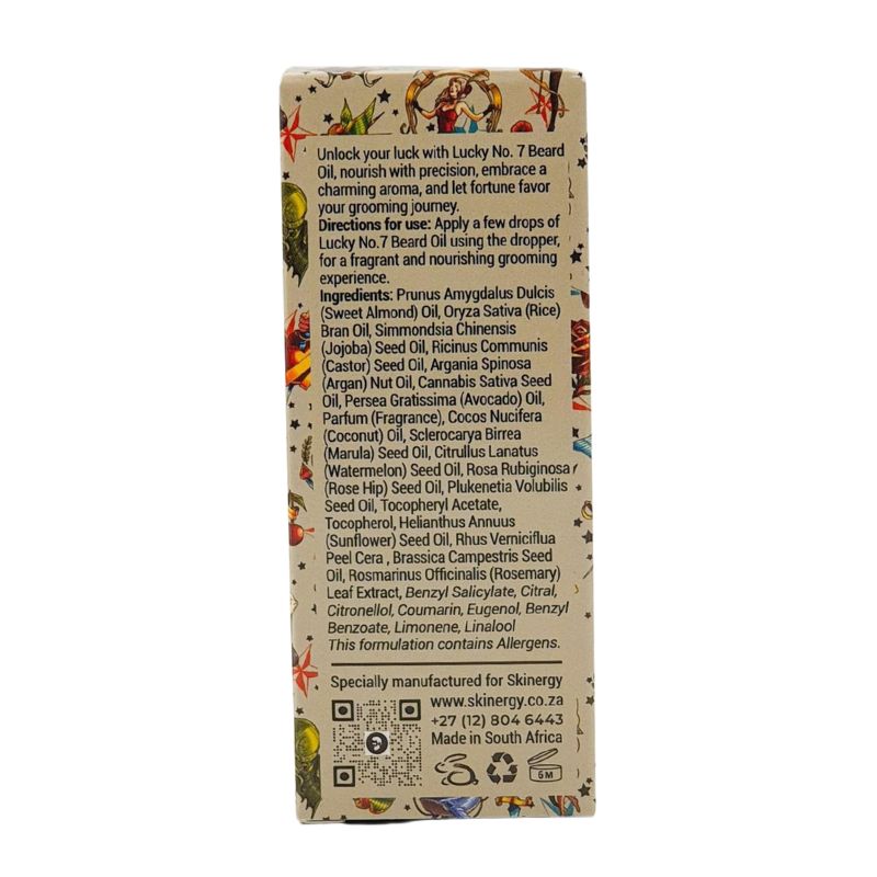 Elevate your grooming routine with Lucky No. 7 Beard Oil from Skinergy. Enriched with Sweet Almond Oil, Jojoba Seed Oil, and a meticulous blend including Castor Seed Oil, it promotes a healthy beard and nourishes the skin. Harness the power of Argan Nut Oil, Avocado Oil, and exotic Marula Seed, among others, for a luxurious grooming experience.